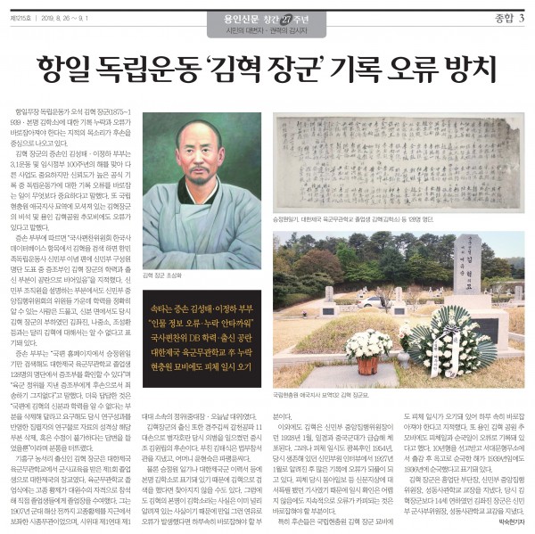 <용인신문>항일독립운동 김혁장군 기록오류 방치