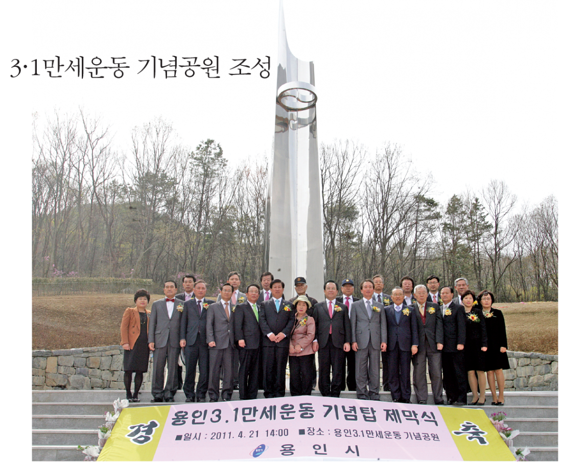 용인 만세운동 발상지인 좌전고개에 3.1만세운동 기념공원을 조성한데 이어 2004년부터 추진해 온 기념 탑 건립을 2011년 4월 21일 제막했다. 한편 수지3·1만세운동 기념탑도 2009년 11월에 완공했다. 역사 체 험장이자 애향심과 애국심의 발로가 되는 성지로 발전하기 위해선 용인독립운동 기념관이 건립되어야 한다.